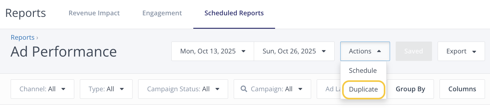 - You can duplicate the standard report with the filter selected and create a saved report for a specific ad label