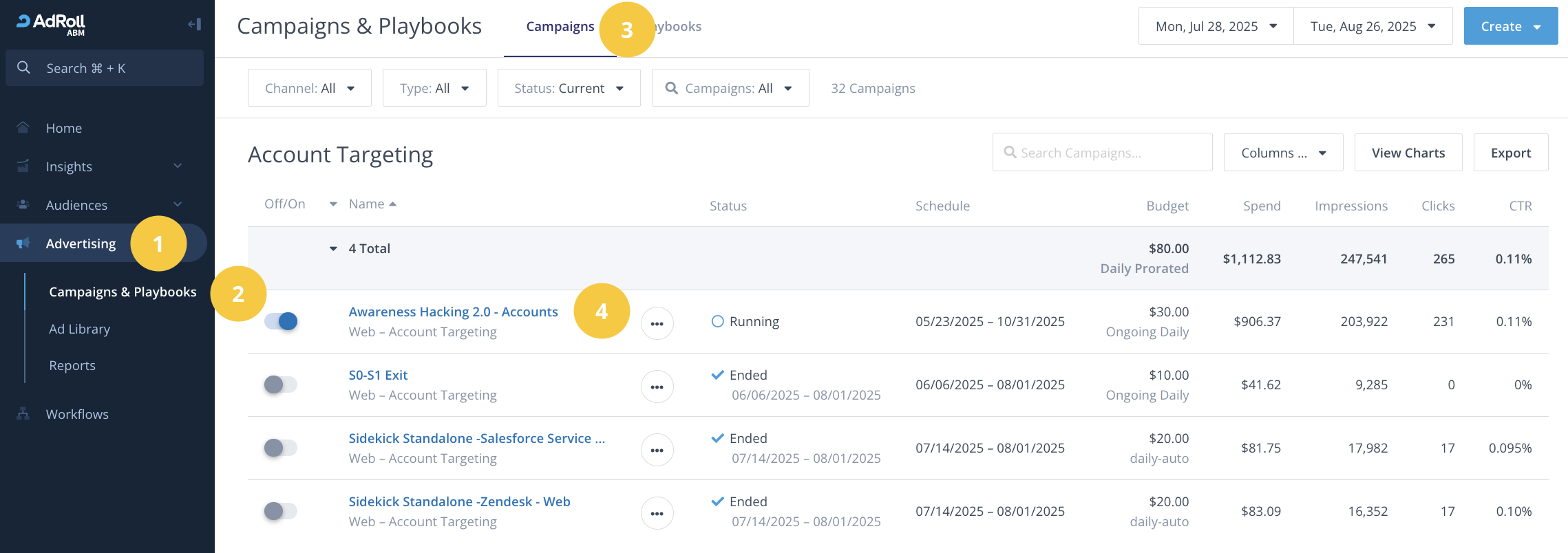 - Click here or go to Advertising > Campaigns & Playbooks and click on the Campaigns tab.