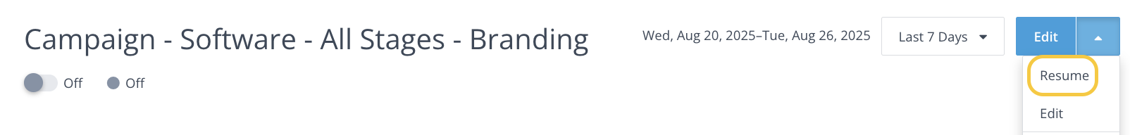 - You can resume a campaign by following the same steps above and clicking Resume.