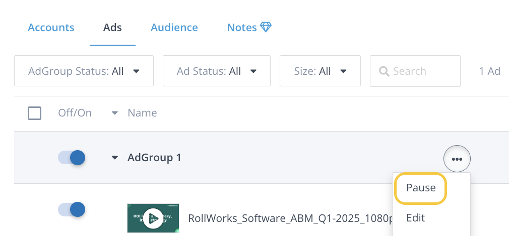 - Find the AdGroup to pause and hover over the three dots next to its name.