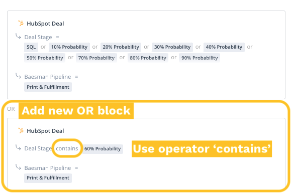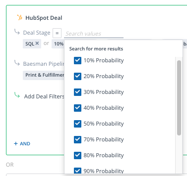 When customizing your Journey Stages using Salesforce, HubSpot, or Marketo, you may encounter an issue when you are not able to select the specific field values you want to use. The example below depicts this issue - the value 60% Probability for the field Deal Stage is missing from the AdRoll Journey Stage logic builder.