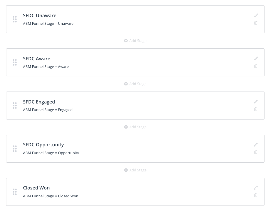 If the same Account meets the criteria for multiple Journey Stages the account will be only added to the stage closer to the bottom of your funnel. The stages at the bottom of your funnel are closer to conversion and further down the sales pipeline.