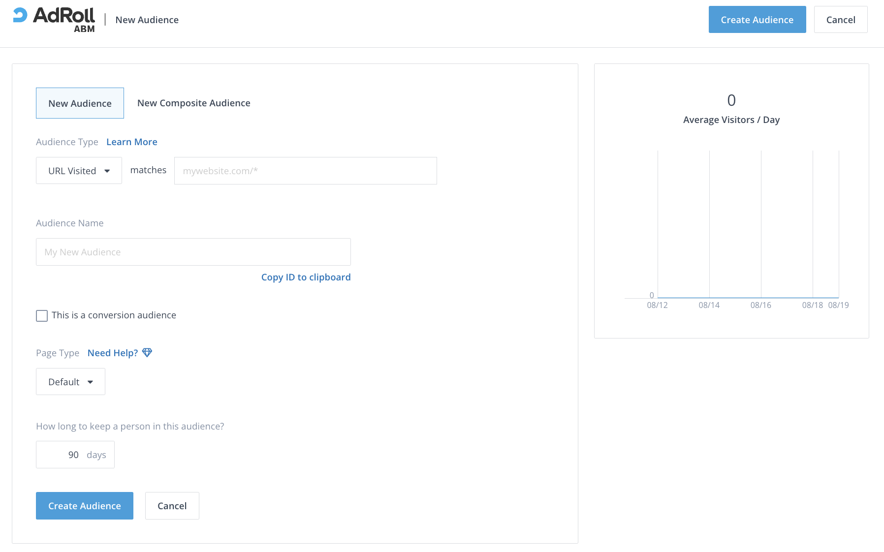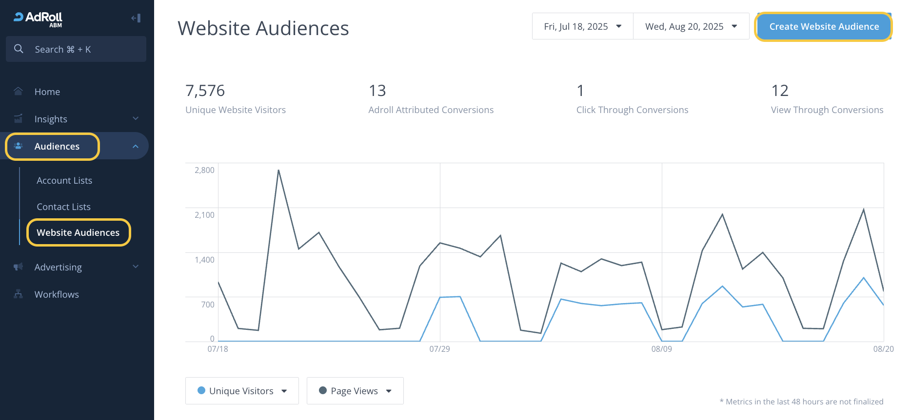 - Log in to AdRoll ABM and navigate to Audiences > Website Audiences