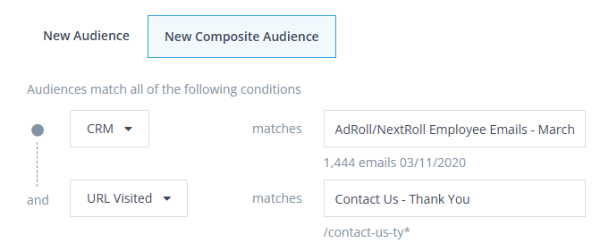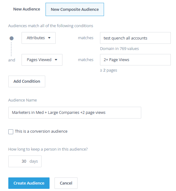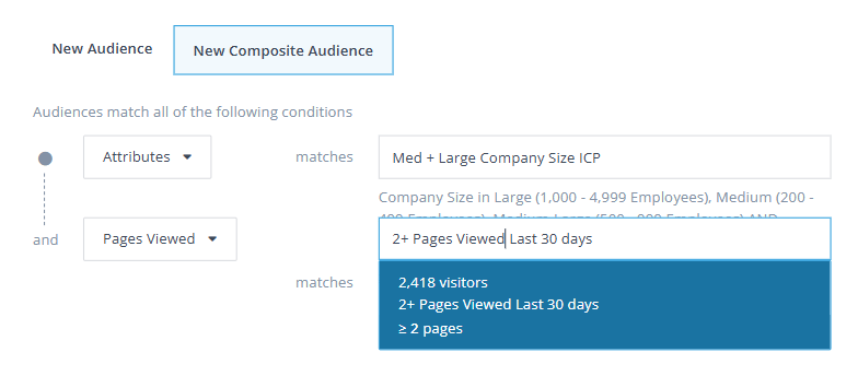 Composite Audiences allow you to overlay multiple and very specific parameters and in return, this will generate a very targeted, high-quality audience. Because of this hyper-targeted approach, the resulting audience may be small.