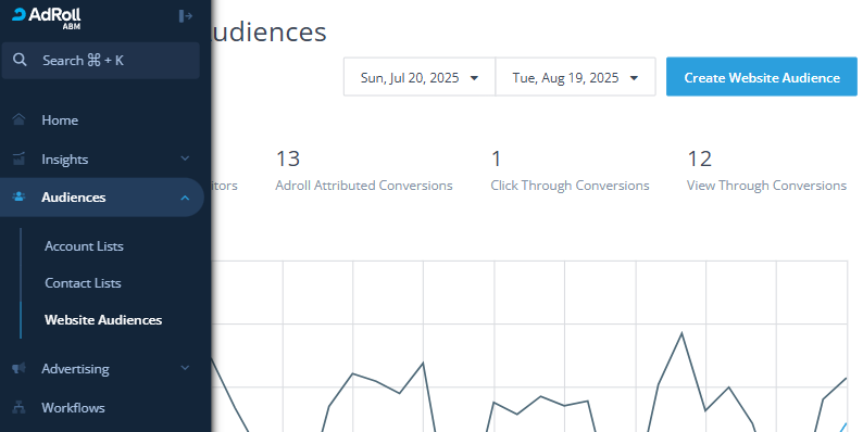 - Log in to AdRoll ABM and navigate to Audiences > Website Audiences.