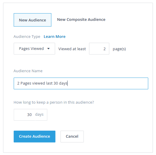 - Audience Name = 2+ Pages viewed Last 30 days