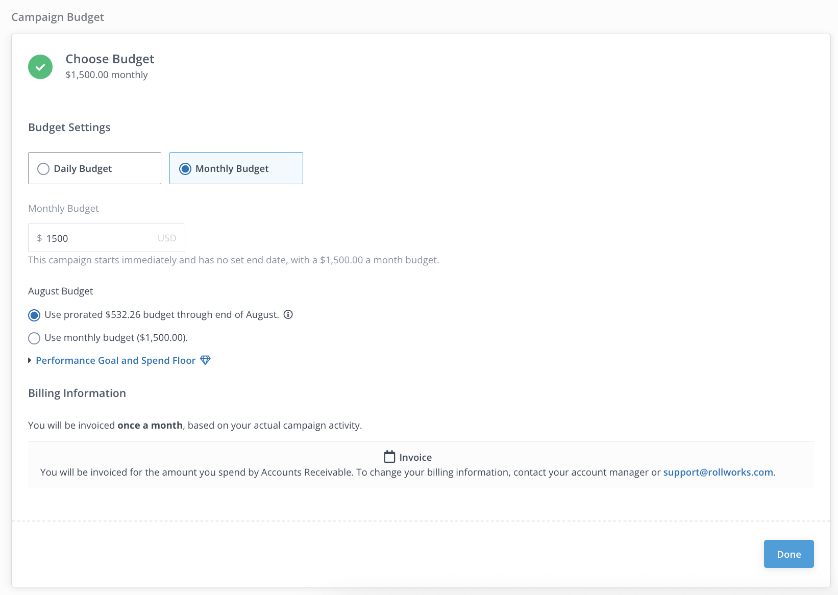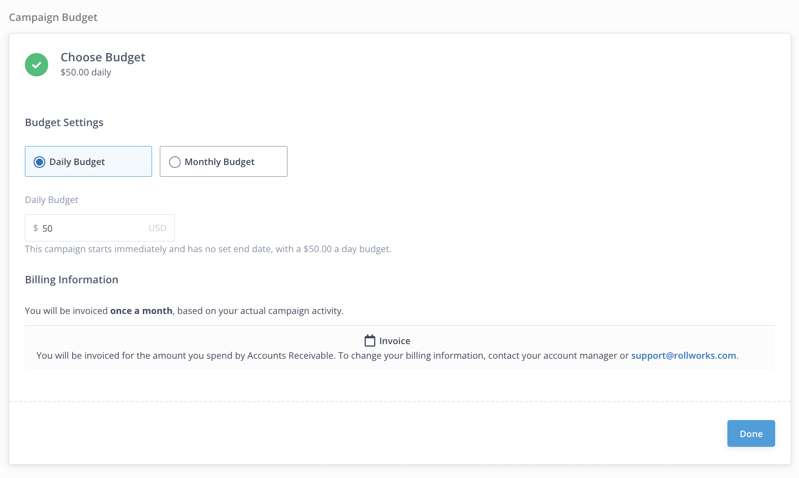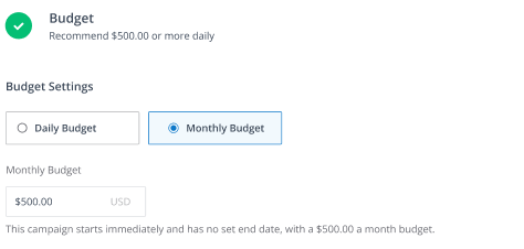 When creating a new Campaign, you will be prompted to enter your desired Daily budget or Monthly budget as part of the campaign setup.