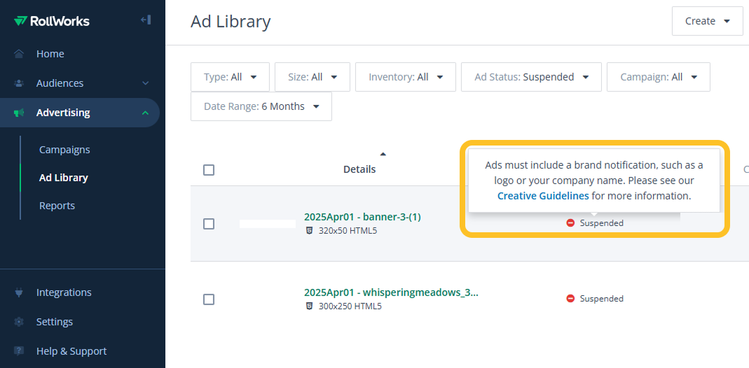- If the ad does not pass the review process, the ad status will change to Suspended. This means the ad is not eligible to run in any campaigns. An email will be sent with more details of the policy violation and information on how to fix the ad so that it is compliant with our Advertising Policies.