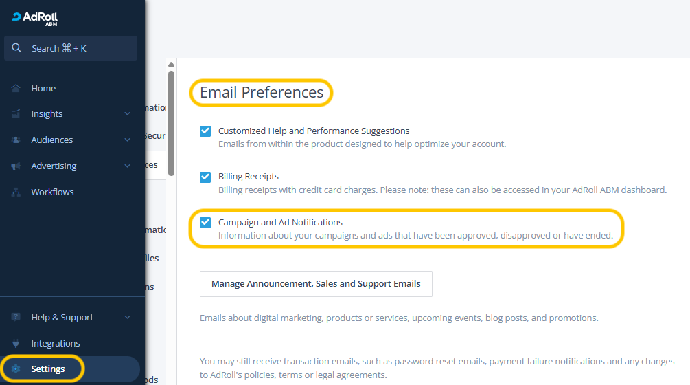 - Log in to AdRoll ABM and navigate to Settings > Email Preferences.