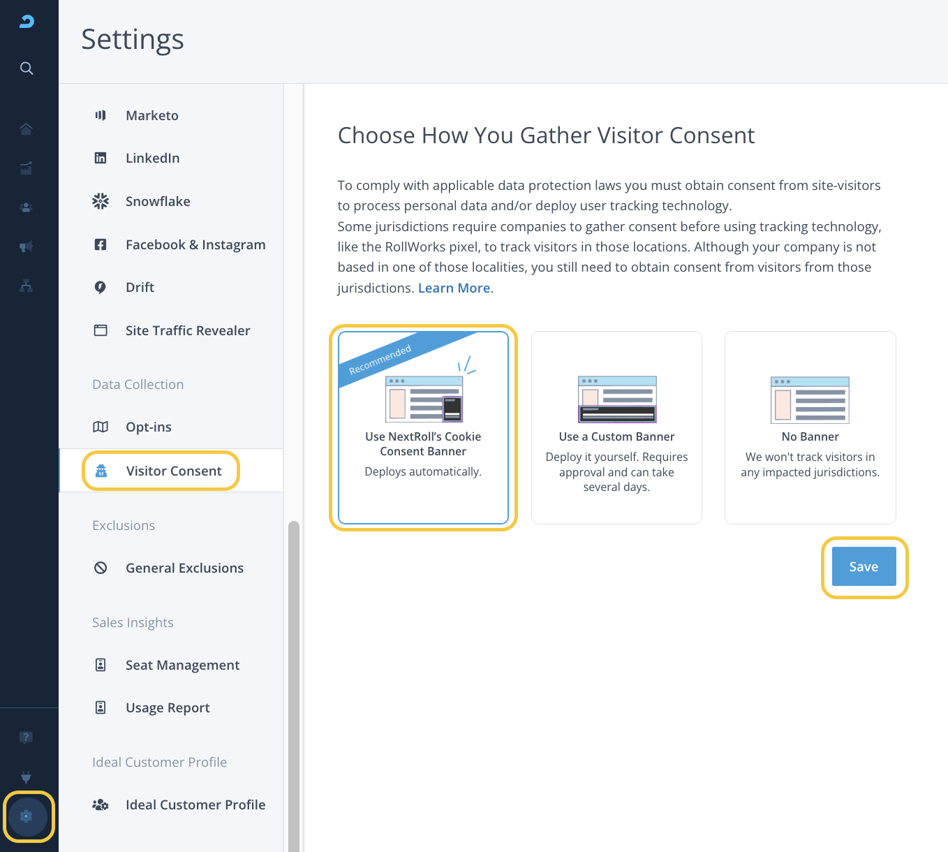 - You will navigate to a “Gather Consent” page that allows you to select the NextRoll Cookie Banner