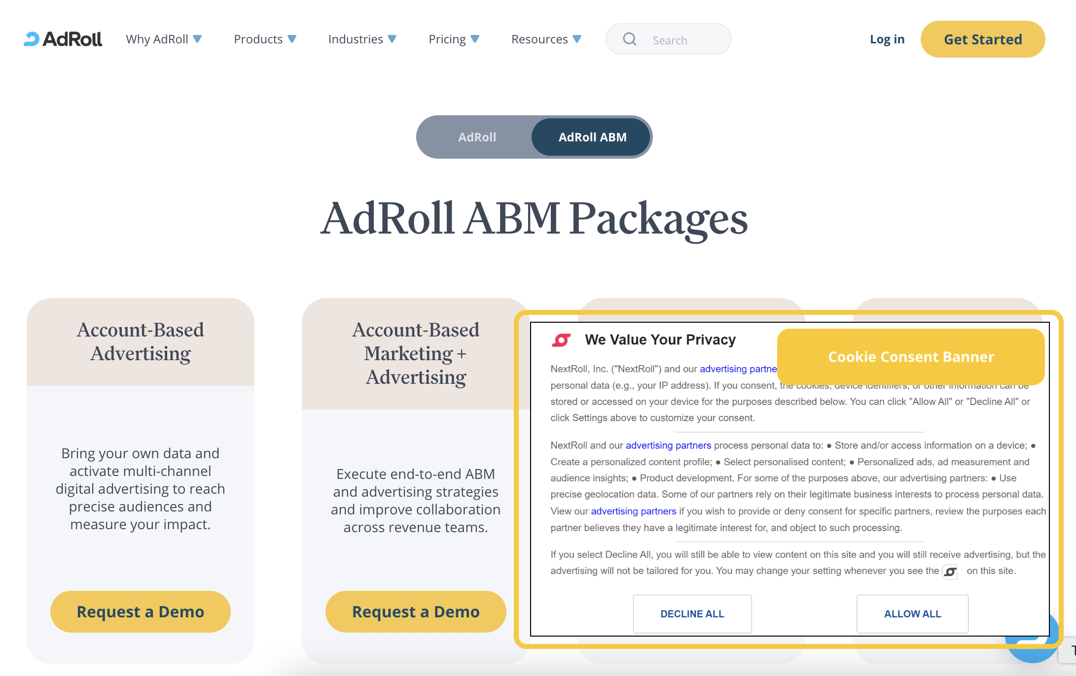 Our banner helps you comply with recent regulatory requirements for your NextRoll services and is designed to easily let your visitors know why and how cookies and other tracking technologies are used. The visitor will then have to either Allow All or Decline the tracking activity.