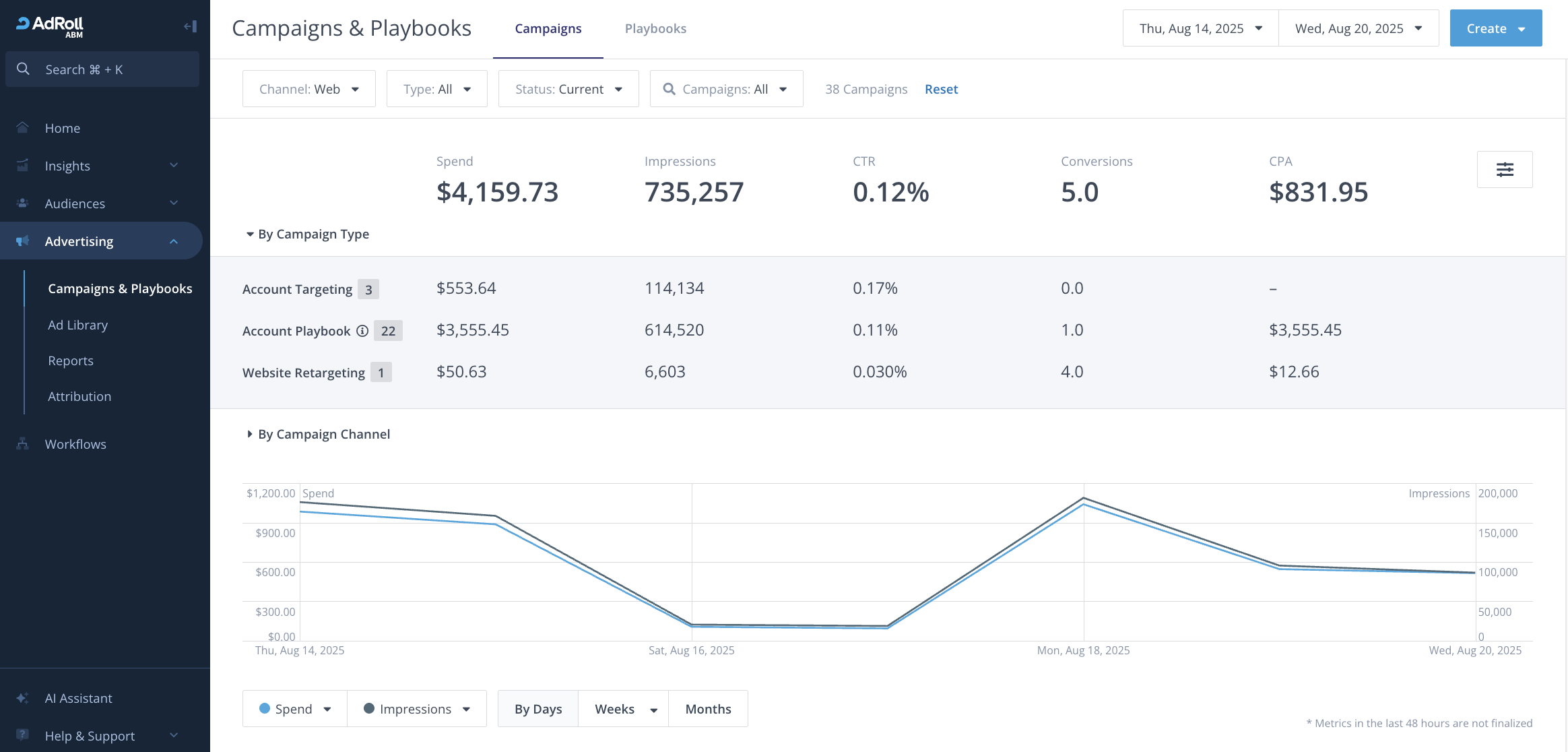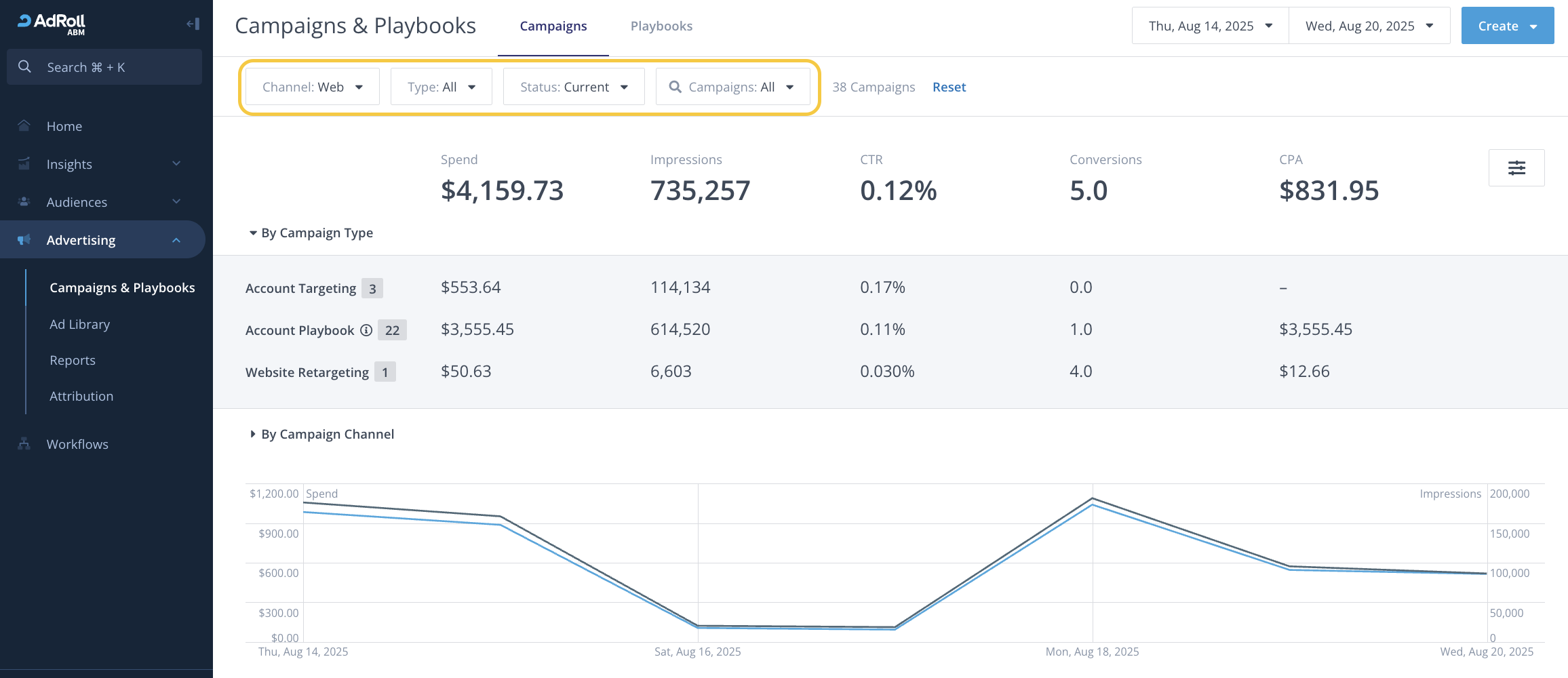 Log in to AdRoll ABM and navigate to Advertising > Campaigns & Playbooks. By default, you will be taken to the Campaigns tab.