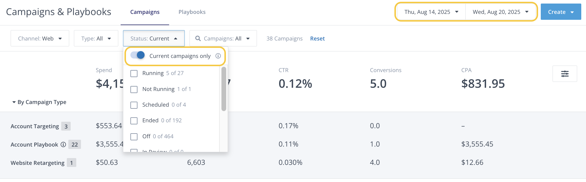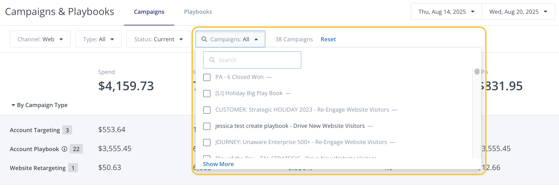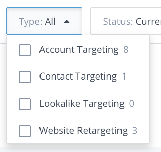 - Type: Allows you to filter by the following campaign types: Account Targeting, Contact Targeting, Lookalike Targeting, and Retargeting.