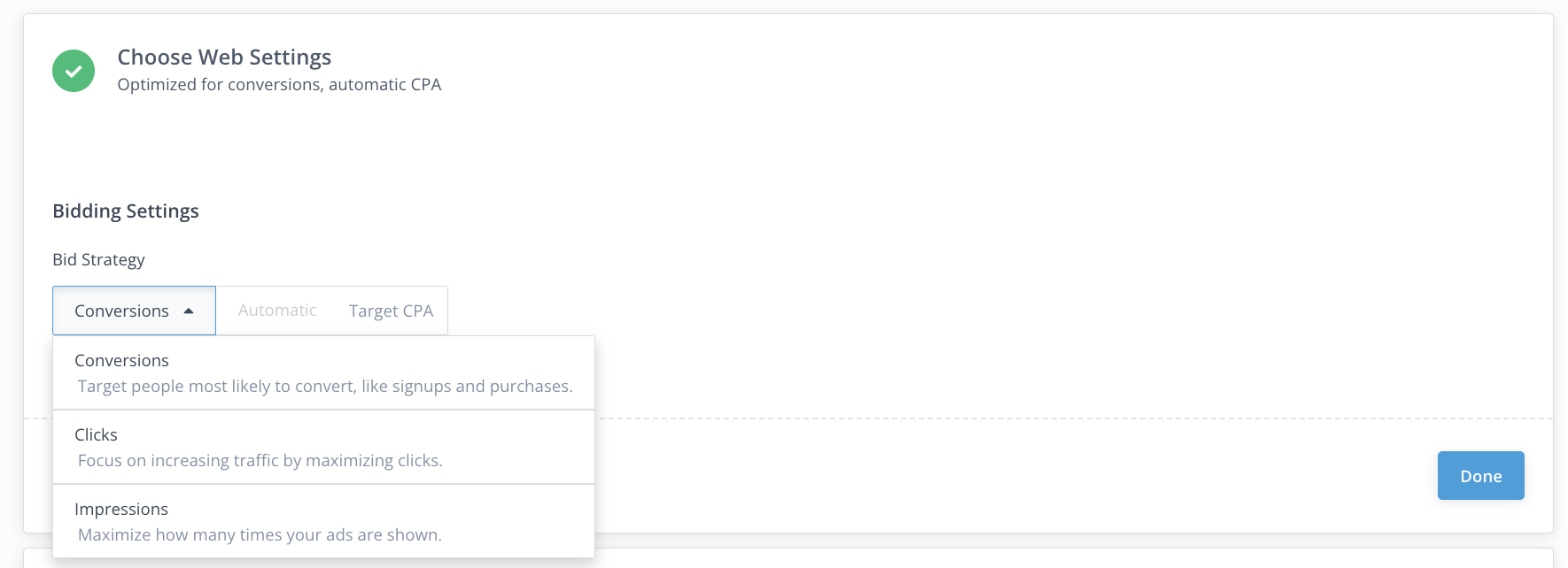 - Leave it Automatic: We will automatically bid to maximize the goal you choose: Conversions, Clicks, or Impressions.
