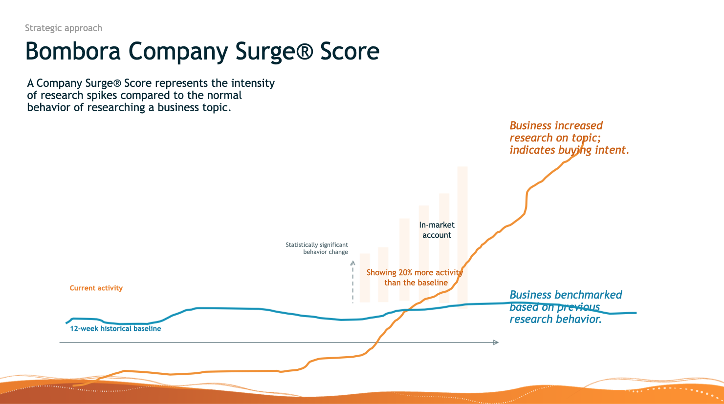- Bombora Company Surge® measures aggregated Account-level intent over a 3-week period relative to a 12-week baseline to determine if a company is showing an increased interest in a specific Intent Topic against the baseline. Bombora Company Surge® data is updated weekly.