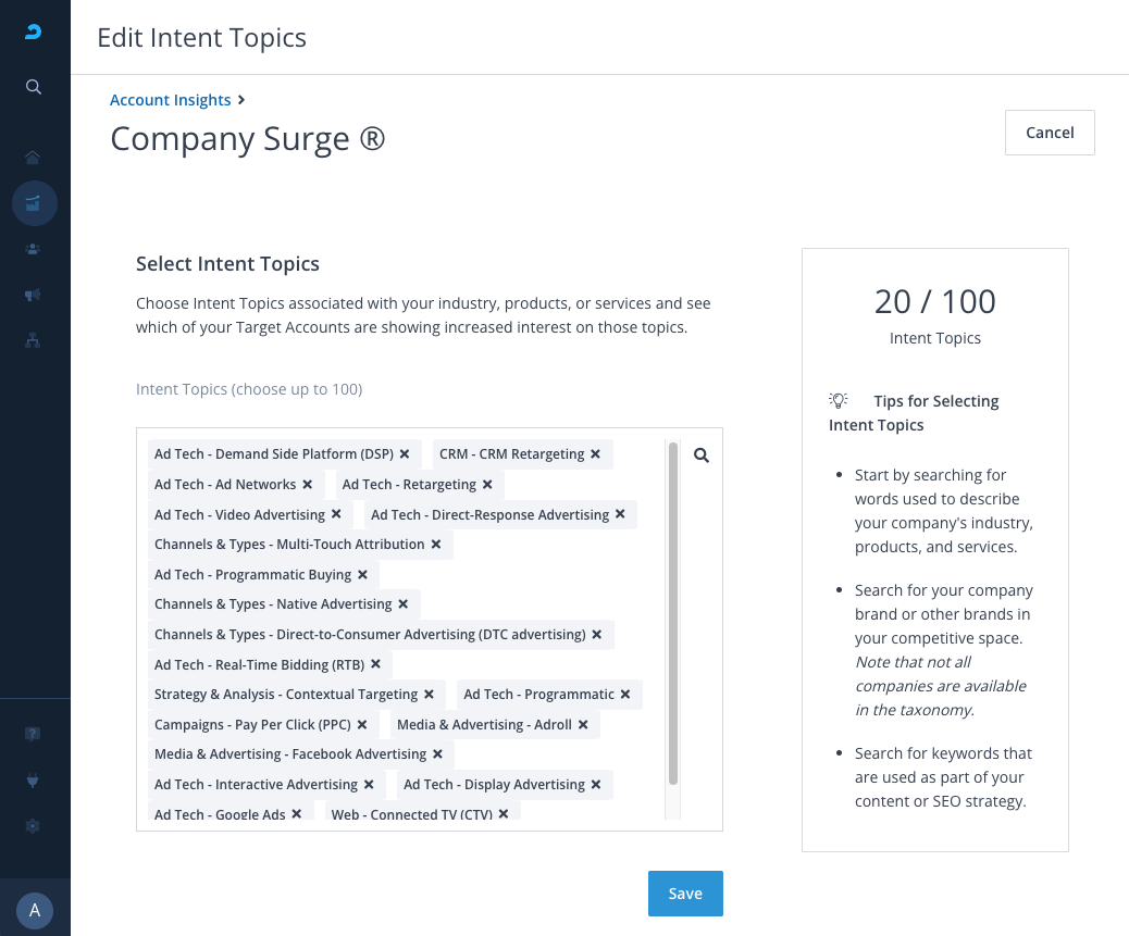 Before you can view which accounts are surging with intent, you first have to select the list of intent topics you want to monitor with the AdRoll ABM platform. The number of Intent Topics you can monitor may depend on your contract.