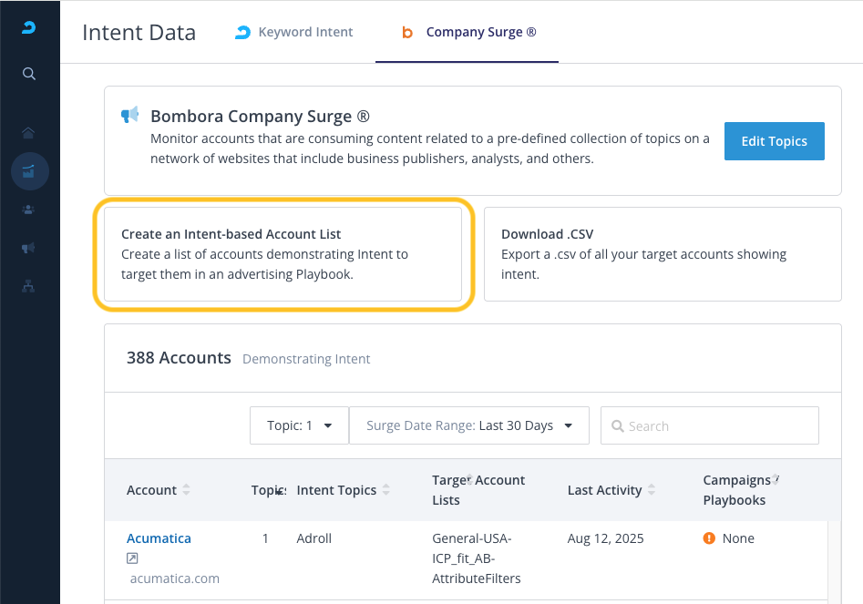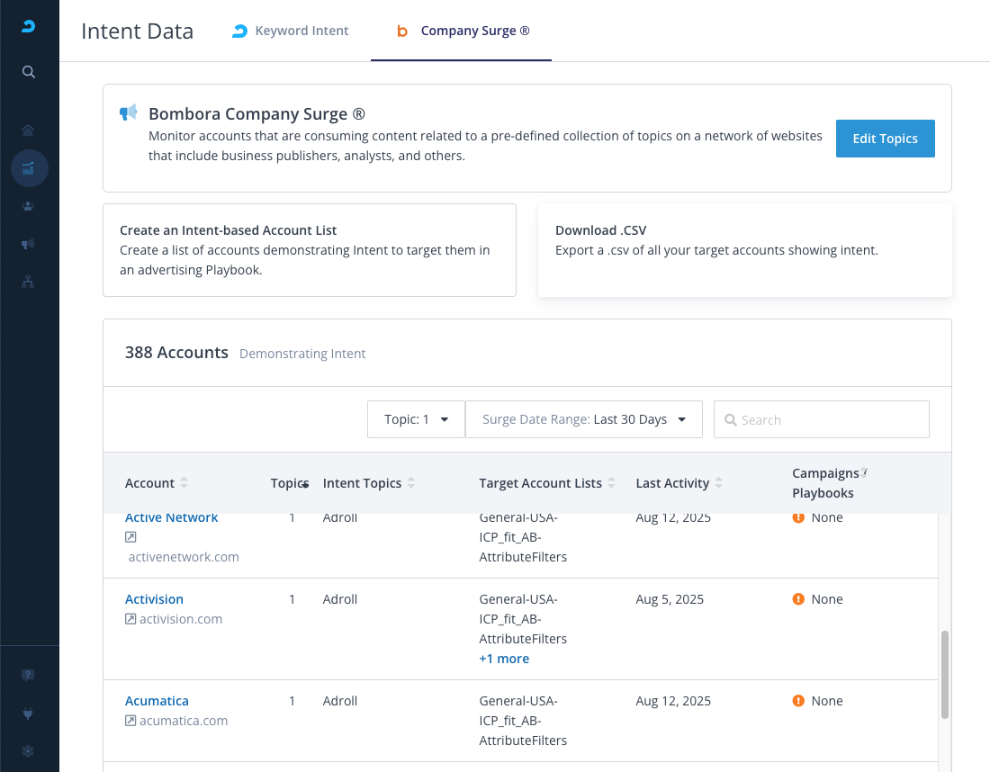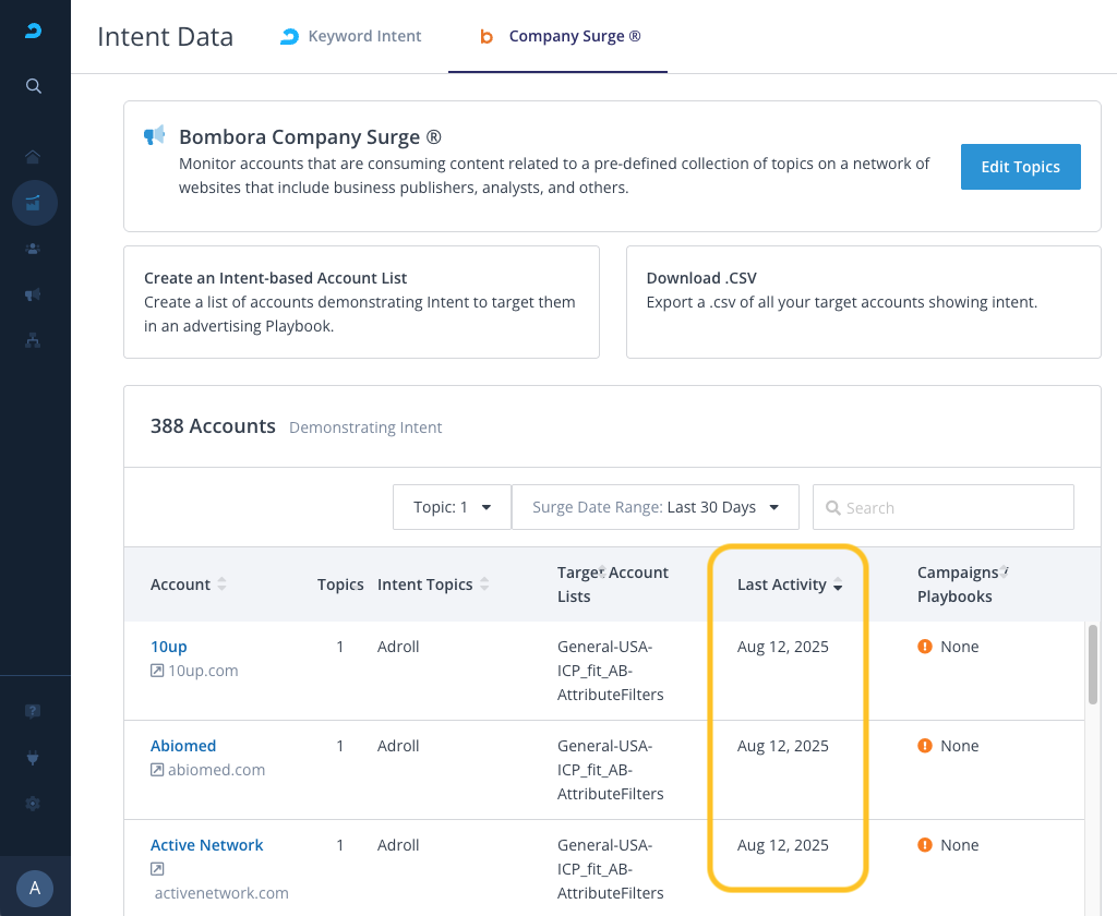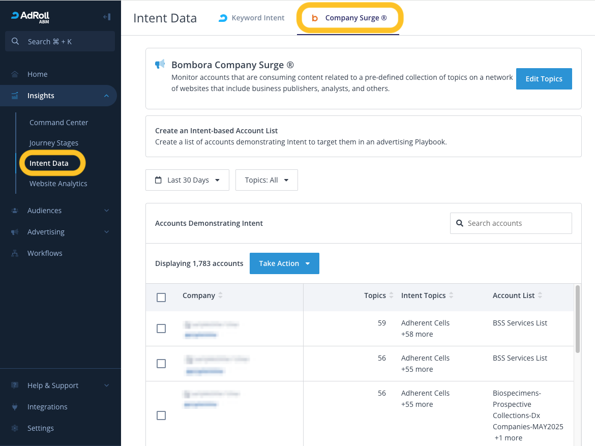- Log in to AdRoll ABM and navigate to Insights > Intent Data > Company Surge.