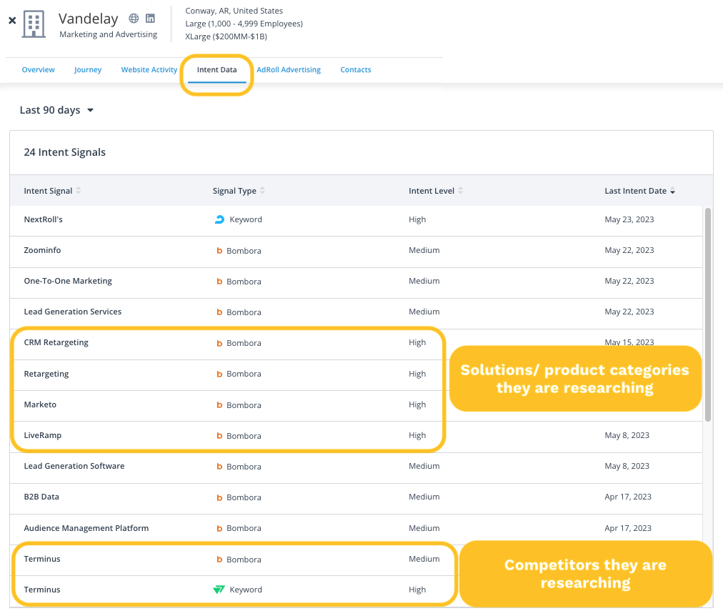 - The AdRoll ABM platform surfaces historical intent data on accounts for the last 90 days, starting on the date you entered an Intent Topic.