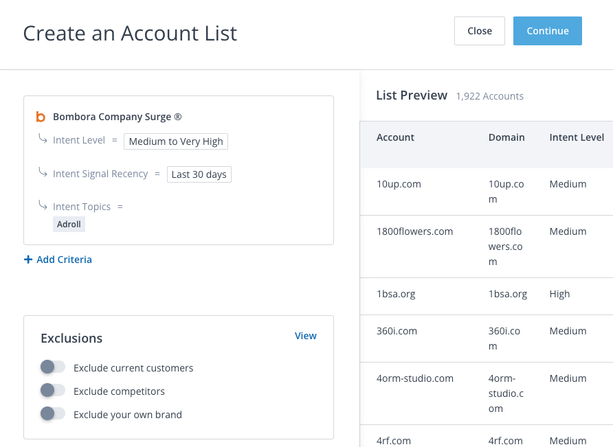 Continue reading this article to learn how to use Bombora Company Surge® Intent in the AdRoll ABM platform, or click here to learn fundamentals about intent signals.