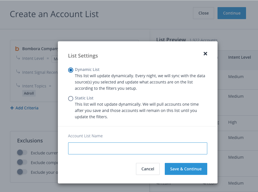 - 'Static', this list will not update dynamically, and it will only include accounts that meet the criteria upon saving.