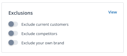 General Exclusions are available but will not be applied to your Account Lists by default. You can manually toggle on current customers, competitors, and your own brand's general exclusions for each Account List you create. You can change this by editing each Account List's logic. |