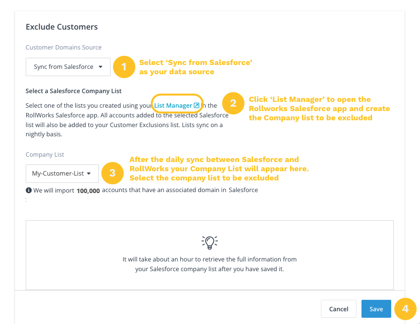 - Create a Salesforce company list using the RollWorks List Manager Salesforce App following these steps. Once you complete the creation of your customer company list, the Salesforce data sync will push the new list to the AdRoll ABM platform at 12:00 pm (UTC). Any new lists created in Salesforce will be available in the AdRoll ABM platform after this daily sync.