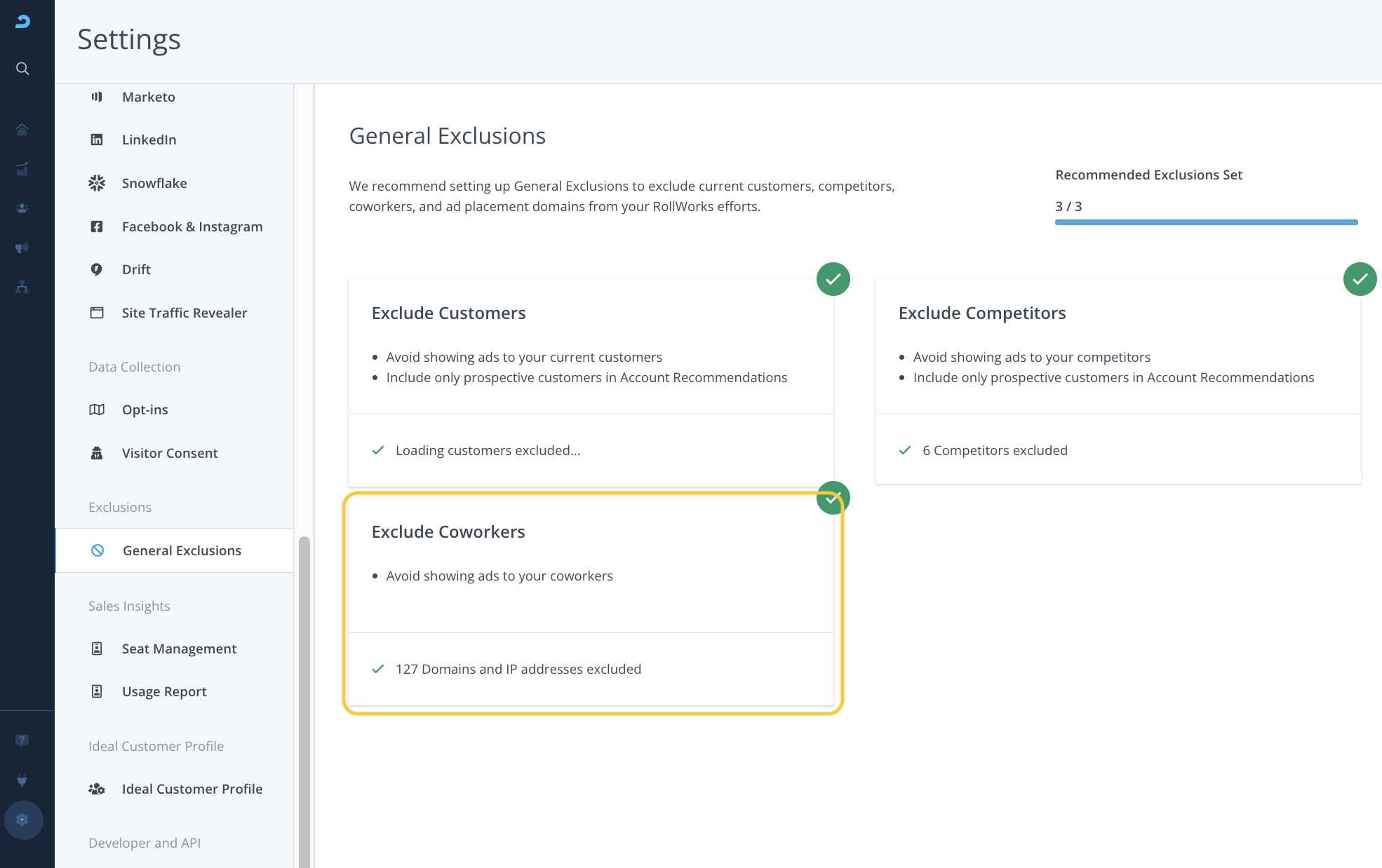 General Exclusions is a setting to dynamically exclude specific audiences from being targeted in your AdRoll ABM advertising campaigns and playbooks.