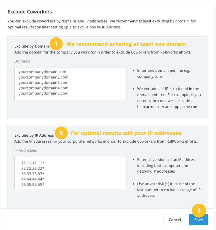 To exclude coworkers, we recommend putting your own business’s domains as well as IP addresses if you have access to them for maximal coverage: