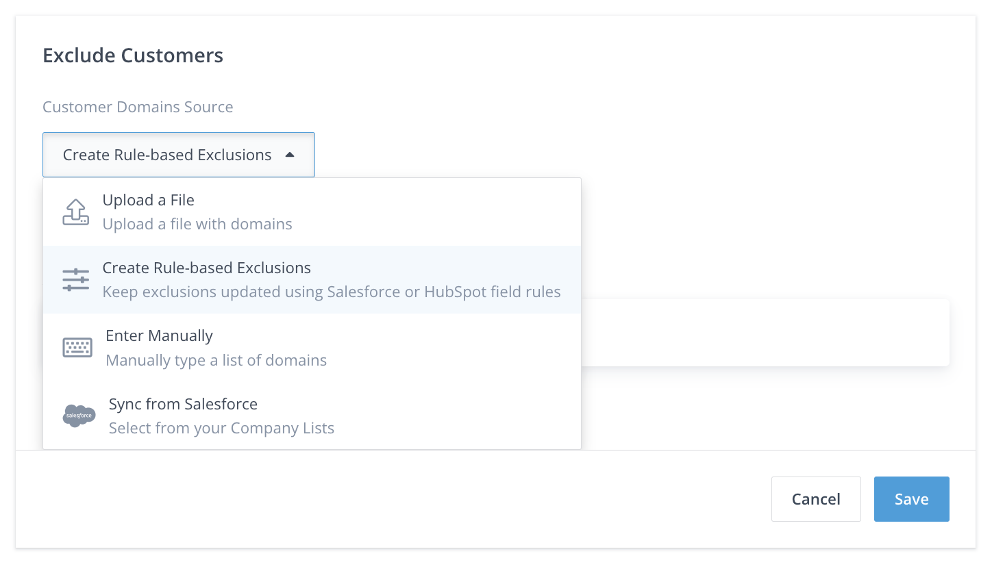 This option was previously available before Rule-based Exclusions with CRM data. If you are using this option, we recommend rebuilding your exclusions list using the preferred Rule-based Exclusions option instead. To continue with this method follow the steps below: