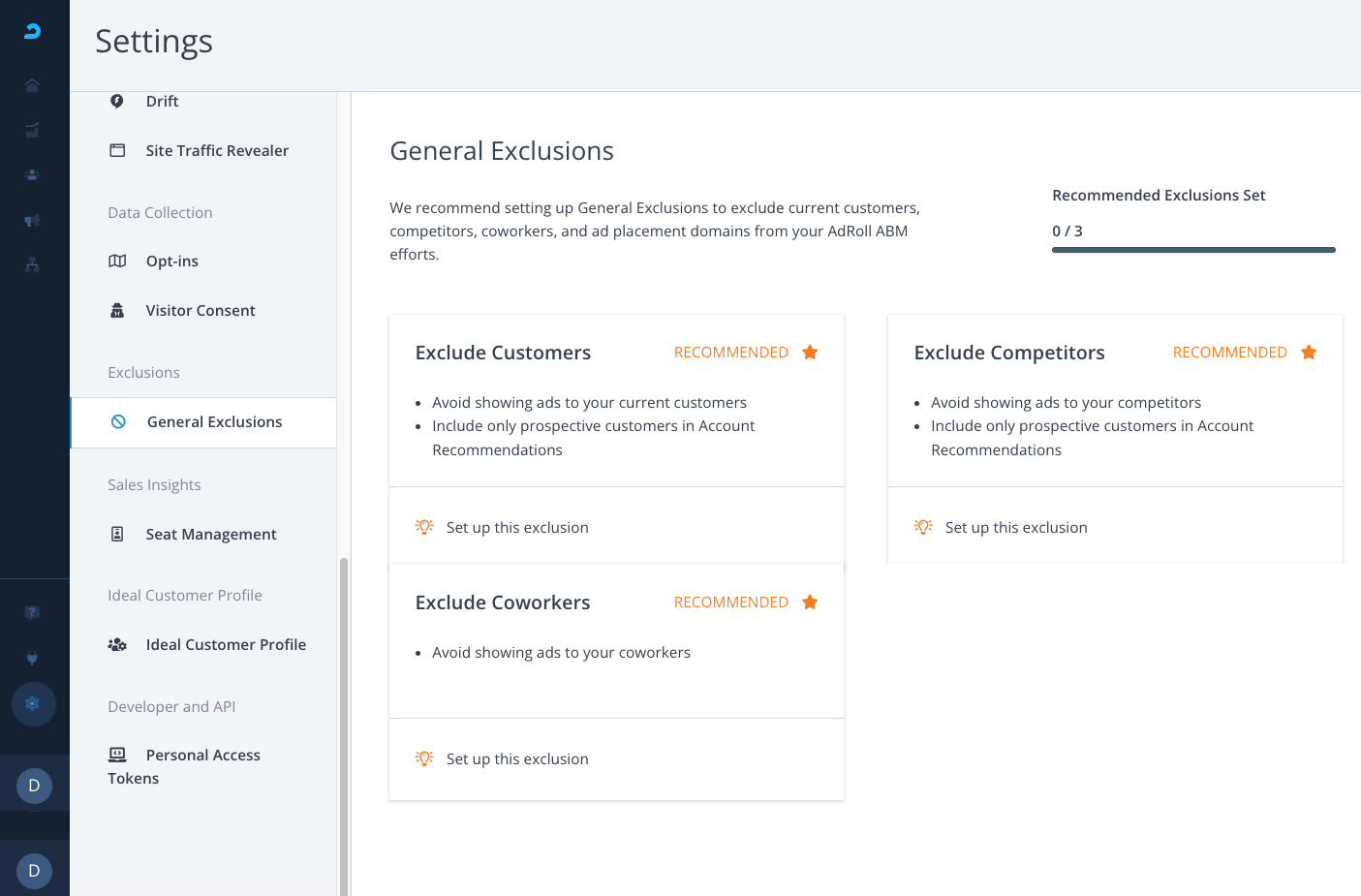- Log in to AdRoll ABM and go to Settings > General Exclusions
