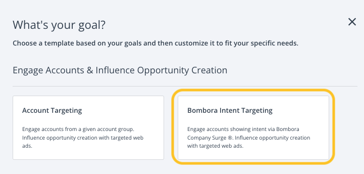 Bombora Intent Targeting Playbooks offers you a pre-packaged way to efficiently use Bombora Company Surge® intent signals by serving web ads to accounts demonstrating interest in specific Intent Topics. Bombora Company Surge® intent surfaces accounts that are researching topics related to an industry, category, or product based on their content consumption across the B2B Web. Learn more here.