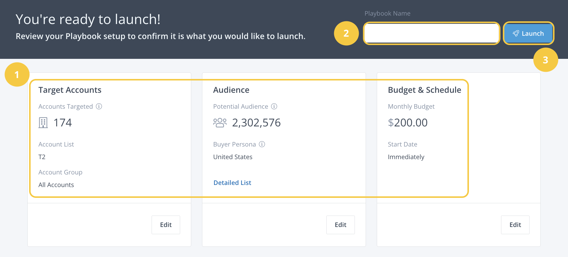 - Review that all the configurations in your playbook are correct: Audience, Campaigns, and Budget.