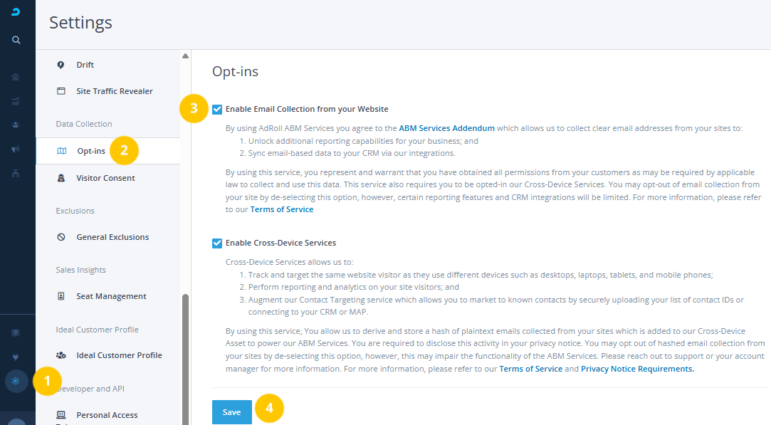 - Log in to AdRoll ABM and go to Settings > Opt-ins