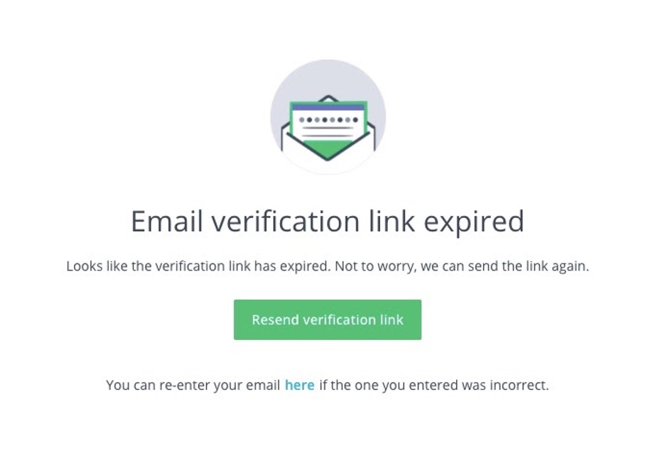 If, when you click your verification email link you are directed to an expired landing page simply click Resend verification link and check your email inbox for a new email from us.