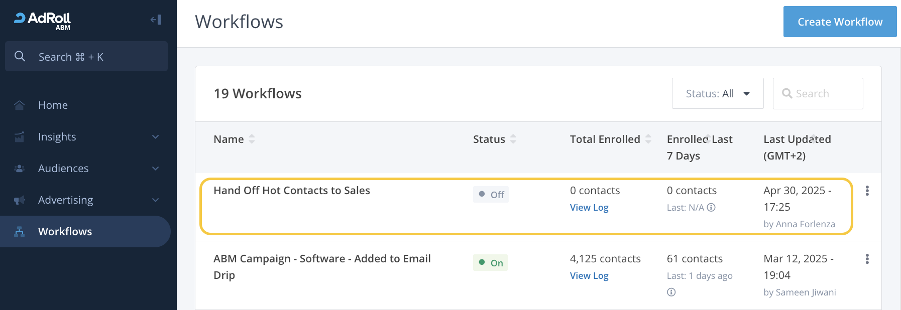 Drafts will be listed on the main Workflows page as Off.