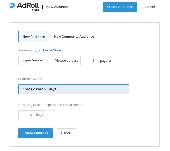 To launch this tactic, you will use our Account Targeting campaign feature combined with a Composite Audience that tracks your target accounts and page views.