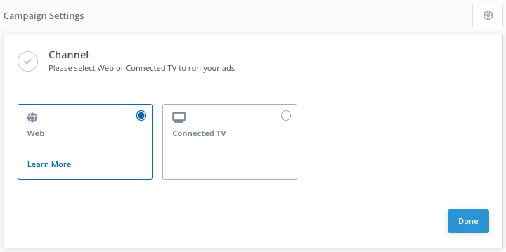 - Select the channel where you wish to advertise: Web or CTV, and click Done.