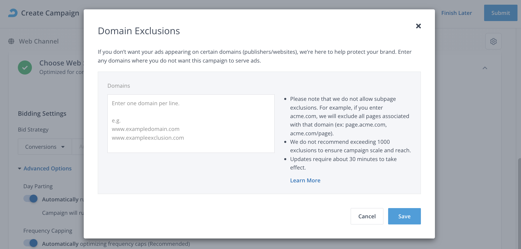 - Under Campaign Exclusions select Add domains to exclude.