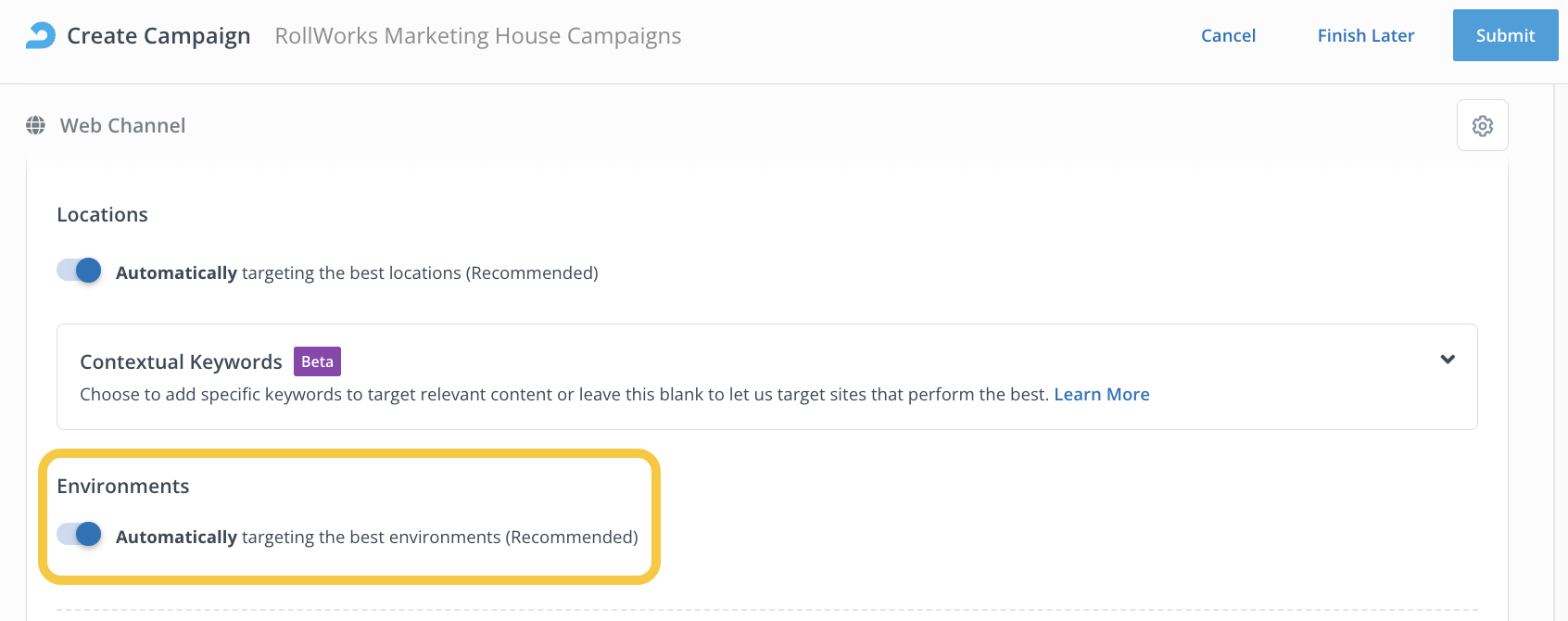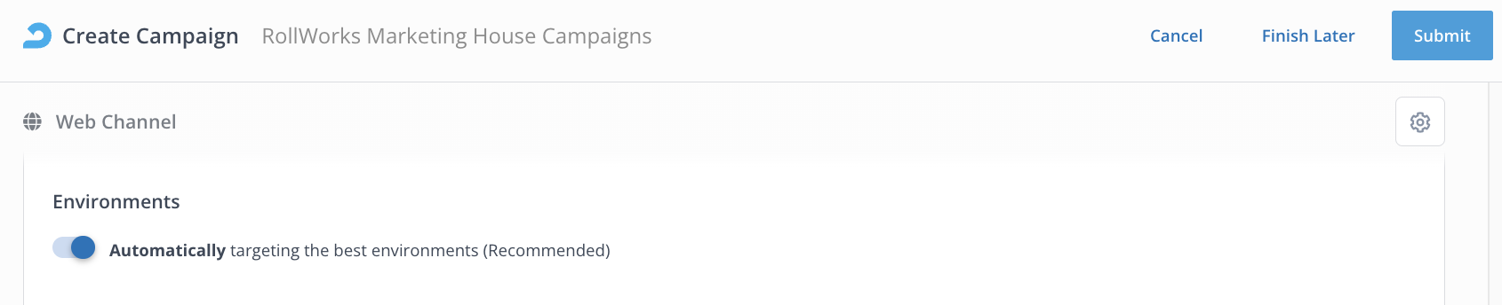 By default, web channel campaigns serve ads to the users in your audience across Desktop, Mobile Web, and Mobile Apps. We recommend using the Automatic Environments default setting to cover 100% of users in your audience, regardless of the type of environment.