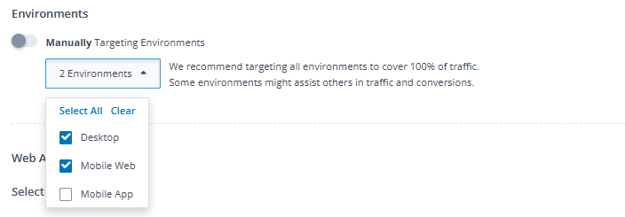 - Please note that performance and reach will be impacted. While manual environment targeting offers flexibility, we recommend targeting all Environments automatically to cover 100% of traffic and maintain optimal performance.