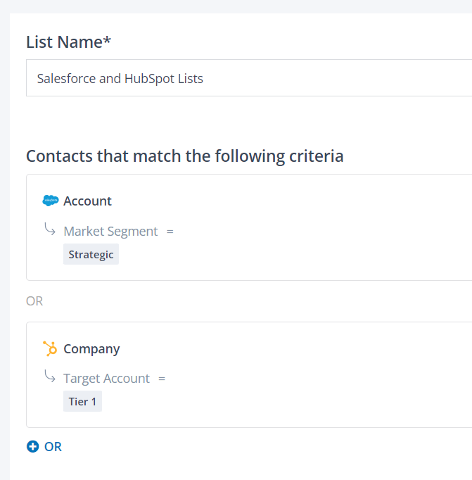 You can combine HubSpot, Salesforce, and/or Marketo filters using OR operators to pull data from all these sources simultaneously.