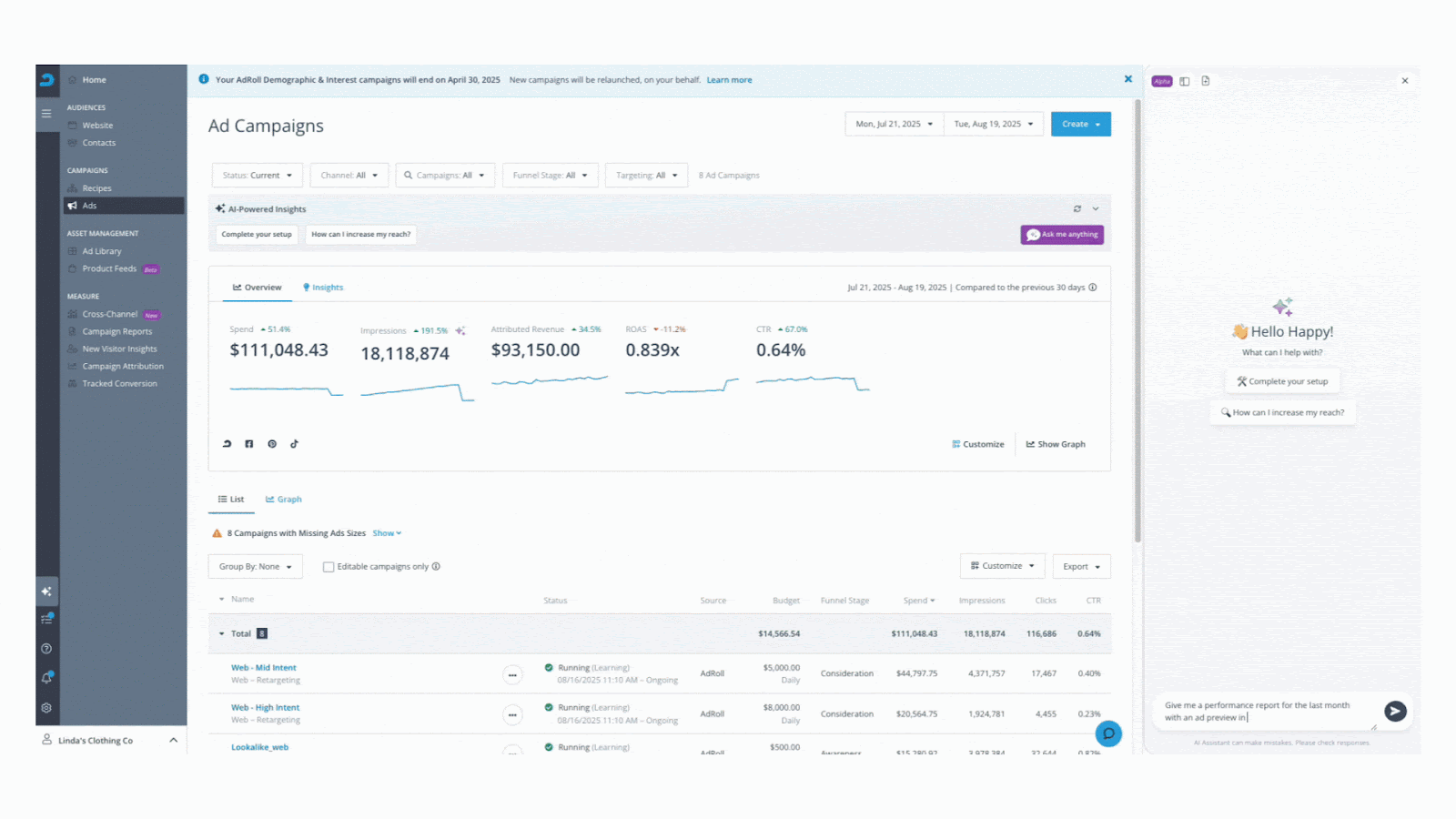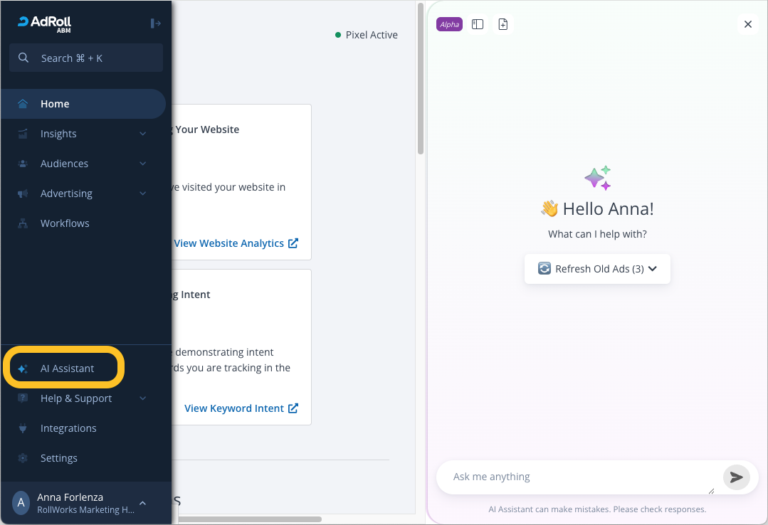 The AdRoll AI Assistant helps simplify that work by providing intelligent guidance, helping you identify and implement optimizations, and generating tailored reports. In AdRoll ABM, the assistant can be opened from the left-hand navigation whenever you need support with critical steps in your advertising process.