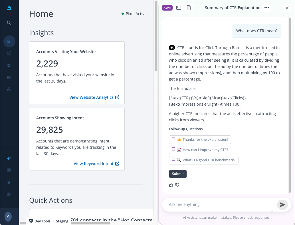 Note: The AI Assistant currently supports advertising campaign reports only. Revenue Impact Reports, Engagement Reports, and other ABM reporting are not yet available.