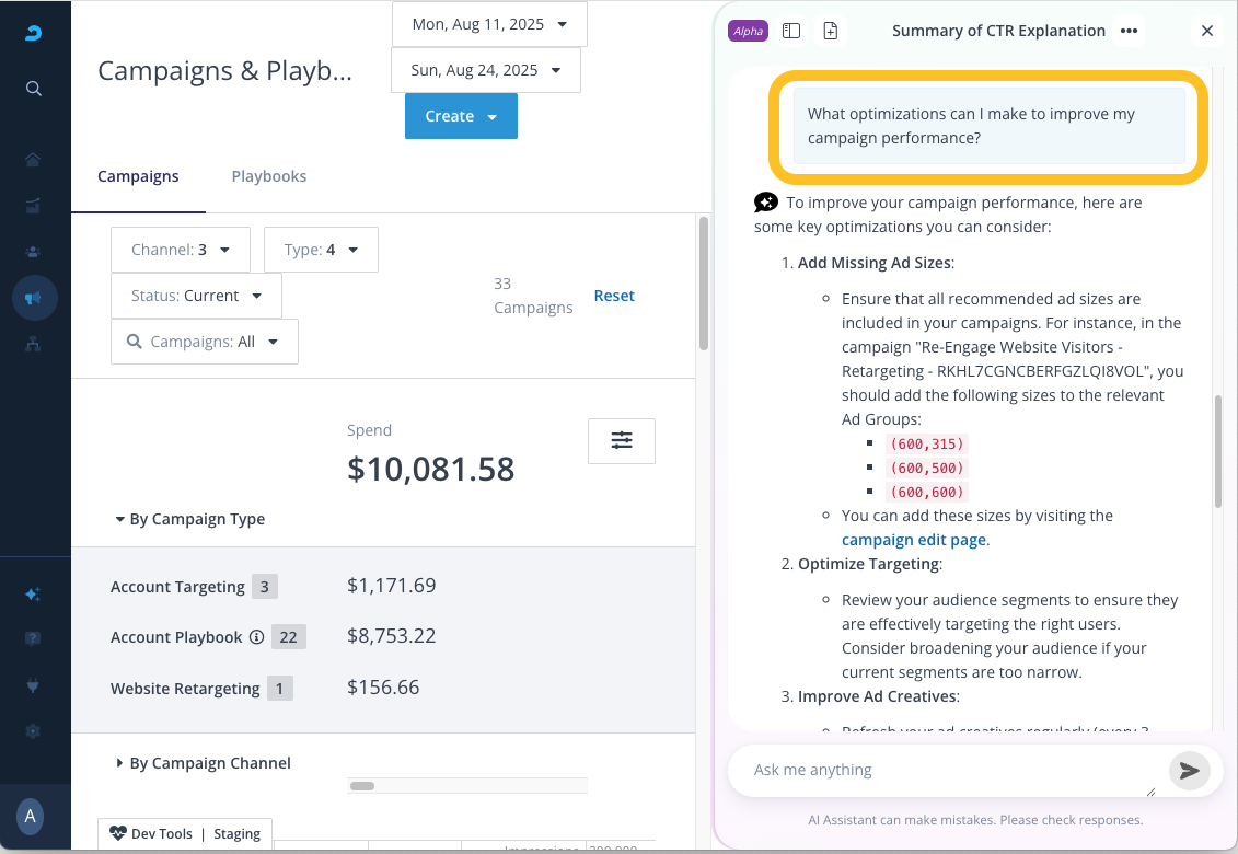 For example, you might type “What optimizations can I make to improve my campaign performance?”