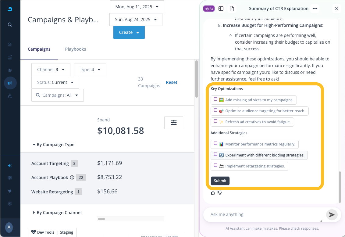 - Access 15+ campaign optimization suggestions, provided in context through chat.
