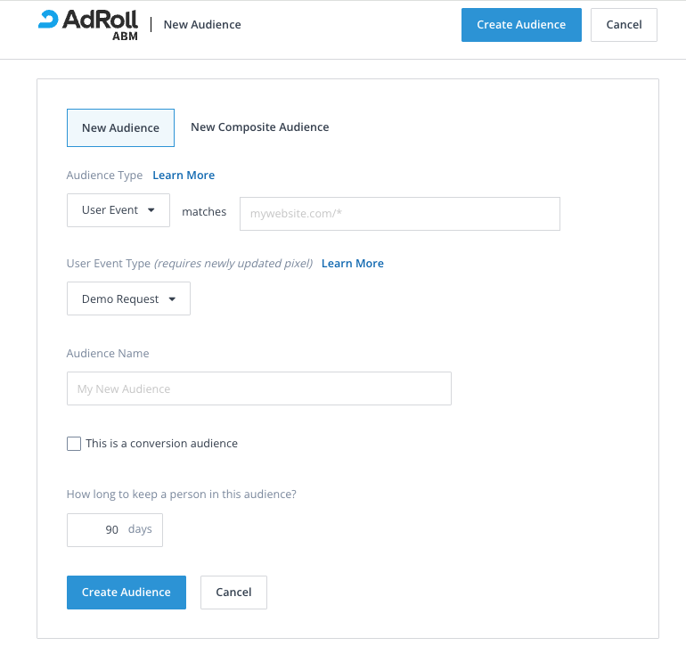 A User Event audience allows you to track standard user actions on (button clicks, form submissions) or off (offline conversion) your website. You can populate these audiences using either the AdRoll Pixel or Server-to-Server (S2S) events. Once a User Event Audience is created, it can be used to positively or negatively target visitors in your campaigns.