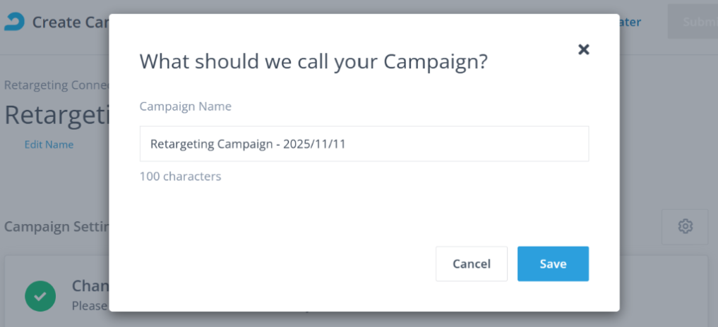 Click Edit Name at the top of your campaign and choose a name that will be easy to identify across AdRoll ABM reports and platform features. We recommend following a consistent naming convention for all your campaigns.