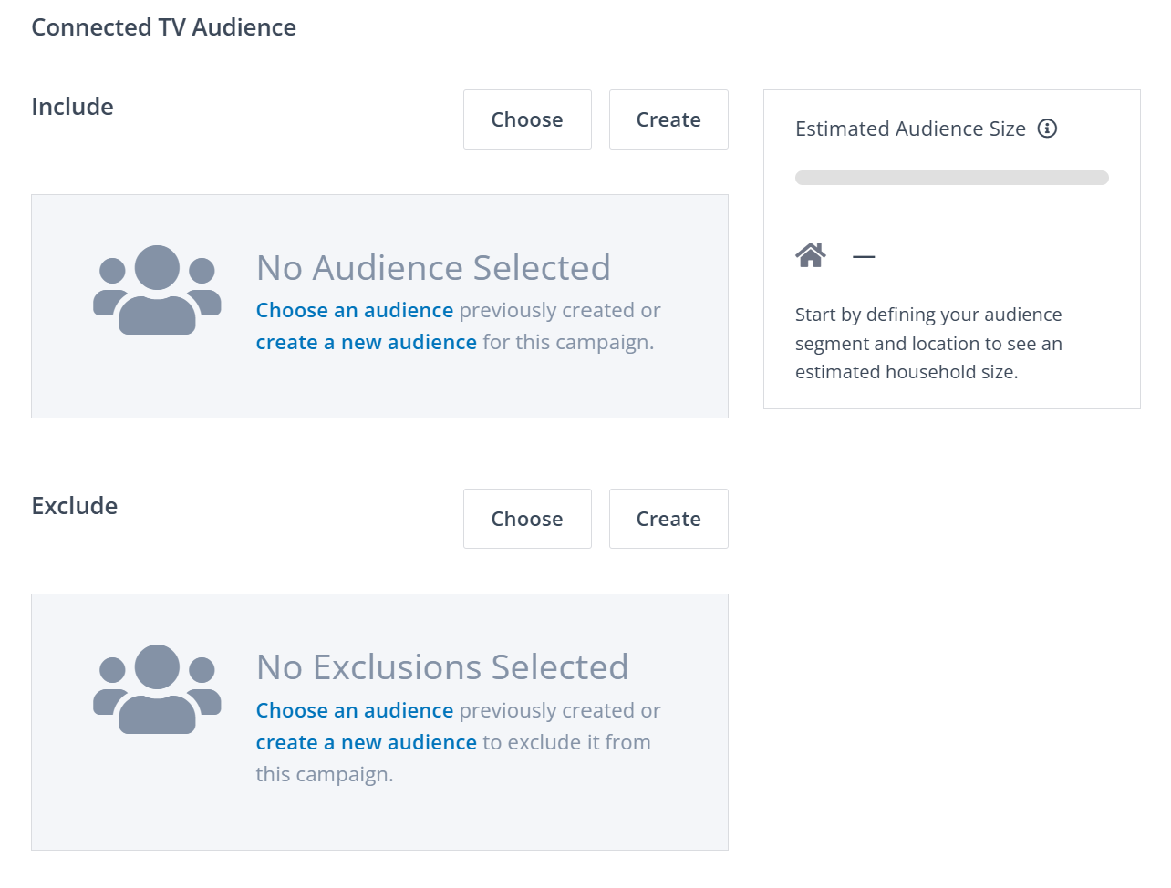 After selecting your audience segments and location filters, this widget will show you the estimated size of the number of households eligible to see your CTV ads. These numbers may change over time depending on how many users do we track in your selected audience and the audience duration.