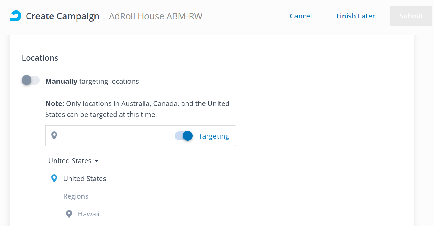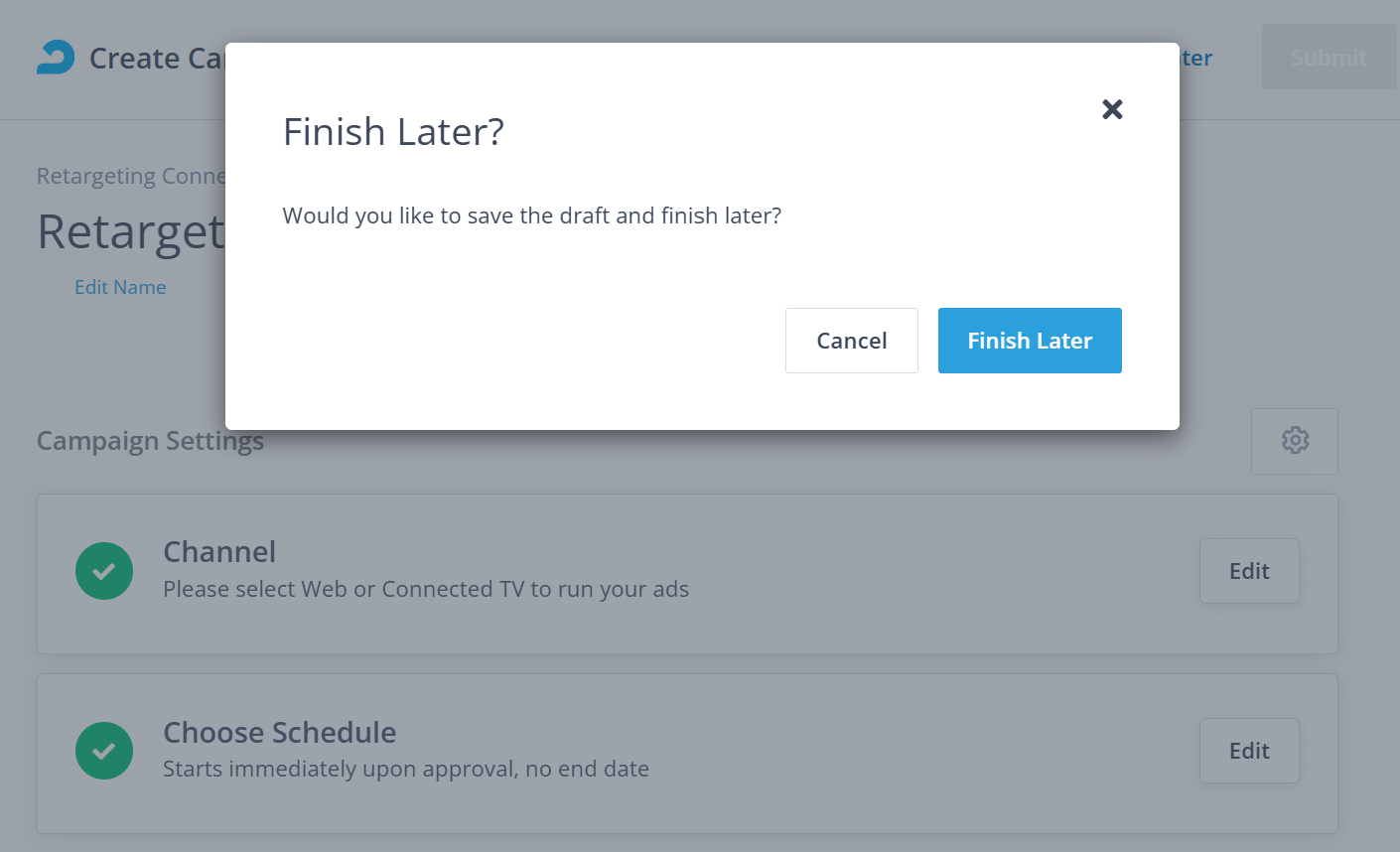 Once you're done setting your campaign, scroll up to the top of the page and click Submit. You can also click Finish Later to save your campaign as a draft.