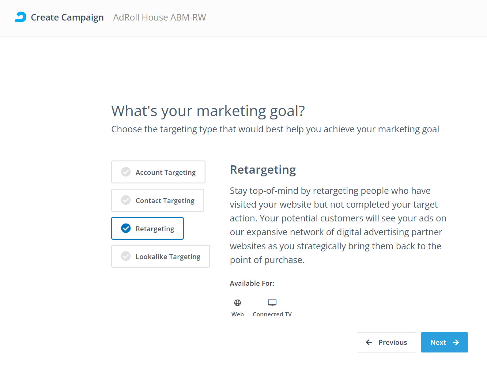 Once you install the Pixel, the AdRoll ABM platform will track your website traffic. You can then launch a CTV Retargeting Campaign to stay top-of-mind by retargeting people who have visited your website but not completed your desired conversion action (like submitting a lead form).